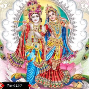 Radha and Krishna stand together, radiating divine charm and eternal love. Krishna plays his flute while Radha listens gracefully with a smile. Their outfits are richly adorned with jewels and vibrant colors of red, blue, and yellow. The background is decorated with a glowing aura and intricate lotus petals. Peacocks and floral motifs enhance the divine setting. Radha’s pose is elegant and captivating, perfectly complementing Krishna’s calm demeanor. The image symbolizes the pure essence of love and devotion. It is a celebration of spiritual harmony.