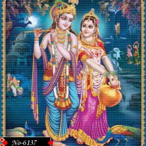 Krishna plays the flute with bliss while Radha looks on with love.