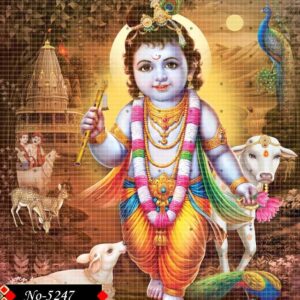 The image is a colorful illustration depicting a young Krishna, He has light blue skin and a cheerful expression, with a tilak on his forehead. He is adorned with an elaborate golden crown featuring a peacock feather, multiple necklaces, and other jewelry. He holds a small golden flute in his right hand.