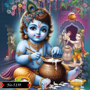 A vibrant depiction of child Krishna in his full glory—adorned with intricate jewels, flowing colorful garments, and a playful yet divine expression.
