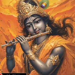 The image shows Krishna playing a flute. He is depicted with dark skin, wearing a golden crown adorned with a peacock feather, and dressed in an orange or yellow dhoti and angavastram. He is also wearing various golden ornaments like necklaces, earrings, and armbands. The background is a warm, abstract orange and yellow.