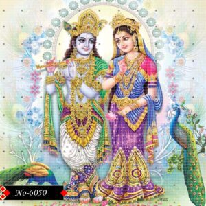 Krishna plays the flute , as Radha looks at him in deep affection. Their bond is accentuated by detailed golden ornaments and vibrant traditional wear.