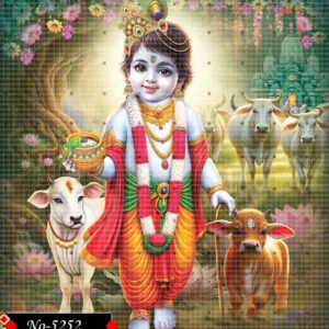 With a soft breeze rustling the leaves, Krishna sits beneath a tree beside his cow. His glowing face and joyful aura fill the image with mythological serenity and divine joy.