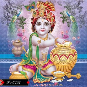 This artwork captures Krishna’s innocent charm, sitting gracefully with twinkling eyes, golden ornaments, and a mesmerizing aura of peace and devotion.