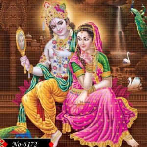 Krishna’s crown sparkles with jewels, while Radha’s gaze reflects affection.