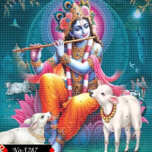 Beside him, his cows rests, their bond ancient and pure.The background bursts with nature’s vibrant blessings—floral and divine.