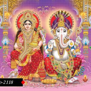 This vibrant image depicts the Hindu deities Lakshmi and Ganesha seated together in a richly decorated setting. Lakshmi, the goddess of wealth and prosperity, is shown on the left, adorned with elaborate jewelry and a red sari, holding a lotus flower and showering coins. Ganesha, the elephant-headed god of wisdom and auspicious beginnings, is on the right, also heavily ornamented, holding a modak (sweet dumpling) and giving a blessing gesture.