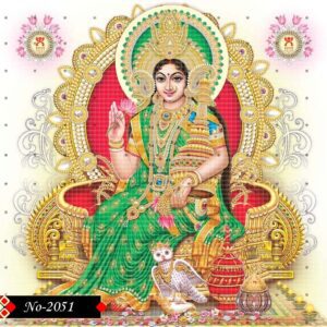 With divine radiance, Lakshmi sits gracefully among symbols of prosperity.
