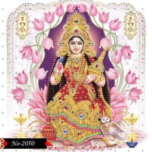 With divine radiance, Lakshmi sits gracefully among symbols of prosperity.