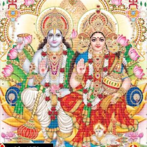 This divine image portrays Lord Narayan (Vishnu) and Goddess Lakshmi in their celestial form, radiating peace and abundance. Lord Vishnu is adorned in majestic ornaments and royal attire, symbolizing protection and cosmic order. Beside him, Goddess Lakshmi exudes grace and prosperity, wearing exquisite jewelry and glowing garments. A radiant divine aura (divyajyoti) surrounds them, enhancing their spiritual presence. Their serene faces and blessing hands offer a sense of comfort, fortune, and divine assurance. This sacred depiction is perfect for invoking blessings of wealth, well-being, and harmony.
