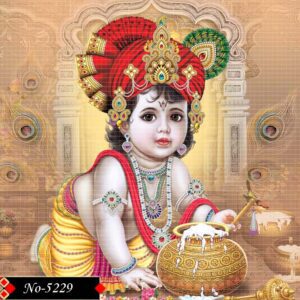 In this heartwarming scene, little Krishna enjoys his favorite treat makkhan while resting peacefully. His radiant face, golden ornaments, and vibrant attire reflect pure joy. The intricate, vivid background brings to life the innocence and divine energy of the moment.