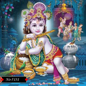 Capturing the innocence of Makhan Chor, this image of little Krishna is a visual delight. His chubby cheeks, sparkling eyes, and a mischievous smile, dressed in rich, vibrant attire, make him look irresistibly adorable and full of divine playfulness.