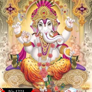 The artwork is rich in color and detail, featuring Ganesha seated on a decorated platform, adorned with jewelry and holding his traditional attributes.
