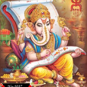 This captivating artwork depicts Lord Ganesha in a thoughtful and focused posture as he writes on a sacred scroll, symbolizing intellect and the origins of ancient scriptures. Seated against an elegant scroll backdrop, Ganesha is richly adorned in a golden crown and traditional attire of vibrant blue and yellow. His serene face exudes wisdom, while traditional symbols, sweets (modaks), diyas, and offerings surround him, enhancing the spiritual ambiance.