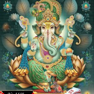 A vibrant and intricately detailed depiction of Lord Ganesha, the Hindu deity revered for wisdom, prosperity, and the removal of obstacles. He is shown seated on a lotus flower, adorned with ornate jewelry and holding his characteristic symbols, signifying his divine attributes and blessings.
