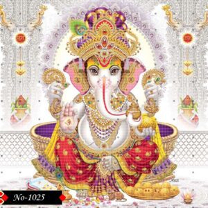 This captivating artwork features Lord Ganesha in a radiant and majestic form, seated gracefully on a traditional golden throne. Adorned with an ornate crown and layers of dazzling jewelry, Ganesha is shown holding sacred objects—a modak, a lotus, a goad, and a kalash—each representing wisdom, purity, and abundance. His red and gold attire complements the intricate white and silver background filled with spiritual motifs, Kalash symbols, and auspicious emblems. Design No-1025 beautifully blends tradition with elegance, making it perfect for devotional decor, pooja rooms, and festive gifting.