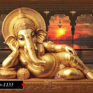 This artwork features a majestic depiction of Lord Ganesha in a relaxed, reclining posture, exuding a sense of calm divinity and royal elegance. His entire form is rendered in rich golden hues, adorned with intricate jewelry and a grand crown, symbolizing prosperity and splendor. Behind him, a stunning sunset glows through beautifully carved arches and hanging temple lamps, creating a serene and sacred ambiance. The detailed background and golden tones amplify the image’s spiritual energy, making it a perfect embodiment of peace, wealth, and divine wisdom.