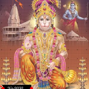 This sacred image shows Hanuman kneeling with devotion, his posture exuding humility and strength. His divine face glows with calm and confidence, blessed by the presence of Lord Ram on his heart. He wears a lavish crown and jewelry, signifying his exalted spiritual status. His golden gada, richly embellished, rests gently in one hand. His raised hand gives blessings, offering peace and courage to devotees.