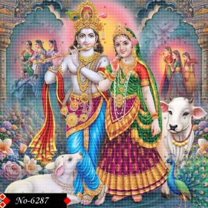 Lord Krishna and Radha stand gracefully together with their beloved sacred cows 6287