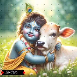 This image depicts a charming illustration of Little Krishna, with his characteristic blue skin, adorned with traditional jewelry and a peacock feather in his hair. He is shown affectionately hugging a white calf, both appearing serene and content. The background features a soft, bokeh-like effect of green foliage and light, suggesting an outdoor, possibly pastoral, setting.