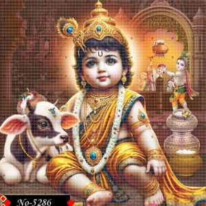 Lord Krishna is rendered with divine elegance, his face glowing with kindness and wisdom. Every detail, from the exquisite golden jewelry to the vibrant, sacred background, speaks of devotion and artistry. This artwork radiates spiritual energy and timeless grace. The cow’s calm eyes mirror devotion and comfort in his presence.