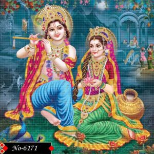 Krishna’s bue dhoti and Radha’s green attire add vibrant contrast to the serene scene.