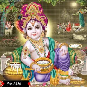 Lord Krishna is seated with a playful yet serene expression, draped in colorful fabrics and ornate gold embellishments. The divine aura and spiritual glow make this piece truly sacred.