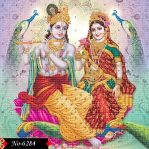 This divine artwork portrays Lord Krishna playing the flute beside Radha, radiating eternal love.