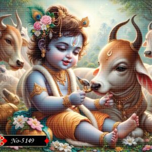 This mythological digital masterpiece portrays young Krishna in a sitting posture playing with cows, exuding a heavenly aura. His glowing skin, dazzling ornaments, and richly colored clothing create a sacred visual that awakens devotion and inner calm.
