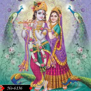 Radha, adorned in a vibrant purple saree, lovingly leans beside him.