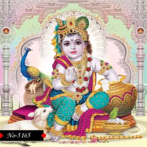 Lord Krishna with his beloved cow in a relaxed sitting posture. His innocent face, decked in golden jewels and vivid dress, evokes a mood of serenity and love.