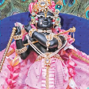 This Poster captures Lord Radharaman’s divine beauty in radiant clothes and shining jewelry, standing in grace.