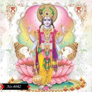 This divine image showcases Lord Vishnu, the Preserver of the Universe in Hinduism, standing in a majestic and serene posture. He is adorned with radiant ornaments and rich, glowing garments that reflect his celestial glory. In his four hands, he holds the gada (mace), shankha (conch), chakra (discus), and padma (lotus) — each symbolizing divine virtues and powers. His calm expression and divine aura exude peace, protection, and cosmic harmony. A soft spiritual radiance (divyajyoti) surrounds his form, highlighting his supreme divinity. This sacred artwork is ideal for invoking blessings of balance, strength, and spiritual growth.