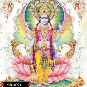 This divine image showcases Lord Vishnu, the Preserver of the Universe in Hinduism, standing in a majestic and serene posture. He is adorned with radiant ornaments and rich, glowing garments that reflect his celestial glory. In his four hands, he holds the gada (mace), shankha (conch), chakra (discus), and padma (lotus) — each symbolizing divine virtues and powers. His calm expression and divine aura exude peace, protection, and cosmic harmony. A soft spiritual radiance (divyajyoti) surrounds his form, highlighting his supreme divinity. This sacred artwork is ideal for invoking blessings of balance, strength, and spiritual growth.