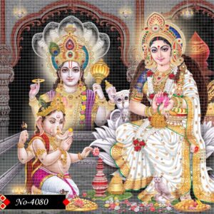 This is a vibrant devotional image depicting Hindu deities. In the foreground, a Lord Ganesha is seated, seemingly offering something. To the right, goddess Lakshmi, is depicted seated on a lotus, adorned with jewelry and holding a lotus flower. In the background, Vishnu, characterized by his conch, chakra, mace, and lotus, is shown with a serene expression, . The overall image is richly colored with traditional Hindu iconographic elements and appears to be a digital or printed artwork often used for worship or decoration.