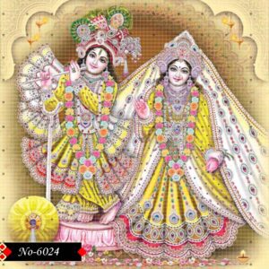 In a luminous spiritual scene, Radha and Krishna’s loving faces take center stage. Krishna plays the flute, adorned in gold. Their eyes speak volumes of spiritual joy and infinite love.