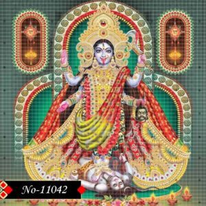 Every element in this image burns with transformative power. Kali’s blue hue contrasts with her golden adornments. Her sword gleams with the energy of truth. The red flowers and vivid patterns around her speak of sacred rituals. Her gaze pierces illusion and ignites inner change. Shiva’s calm expression offers balance to her rage. This image vibrates with renewal and rebirth. Kali here is not an end, but a beginning.