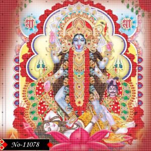 Every element in this image burns with transformative power. Kali’s blue hue contrasts with her golden adornments. Her sword gleams with the energy of truth. The red flowers and vivid patterns around her speak of sacred rituals. Her gaze pierces illusion and ignites inner change. Shiva’s calm expression offers balance to her rage. This image vibrates with renewal and rebirth. Kali here is not an end, but a beginning.