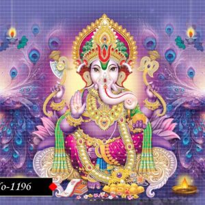This stunning artwork portrays Lord Ganesha, the remover of obstacles and the deity of wisdom, prosperity, and good fortune. Adorned with intricate jewelry and vibrant colors. The detailed background and rich ornamentation add to the divine aura of this sacred depiction