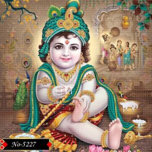 Lord Krishna is depicted in his divine glory, with a radiant face exuding compassion and celestial charm. His golden ornaments shimmer with detail and craftsmanship, while the ethereal background enhances the spiritual essence of the scene. A perfect blend of mythology and artistic brilliance.