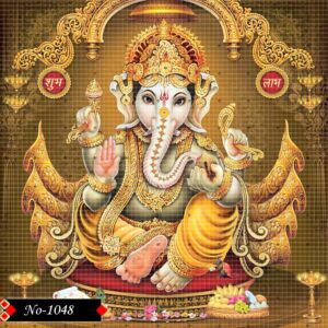 This divine illustration of Lord Ganesha radiates opulence and blessings, depicted in rich golden tones that symbolize prosperity and wisdom. Lord Ganesha is seated on a luxurious red cushion beneath an intricately adorned arch, flanked by the auspicious Sanskrit words “शुभ” (Shubh) and “लाभ” (Labh), meaning “Auspiciousness” and “Gain.” With traditional ornaments, expressive eyes, and symbolic items in his four hands, he exudes grace and spiritual power. The image is perfect for invoking divine blessings of success and positivity.