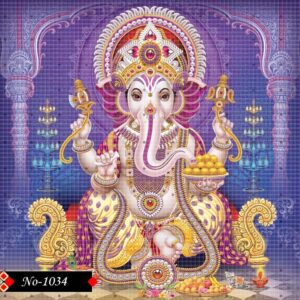 This exquisite artwork features Lord Ganesha seated on an ornate golden throne against a majestic purple backdrop adorned with temple pillars and glowing lamps. Embellished in royal purple and gold garments with intricate jewelry, Ganesha holds a modak (sweet) and traditional weapons, symbolizing abundance and protection. His serene expression and divine presence radiate spiritual grace.