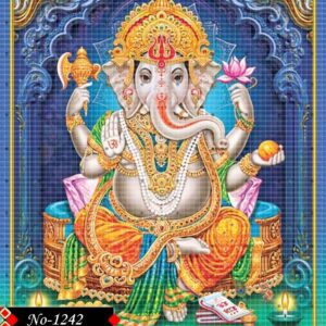 The deity is portrayed in a silvery white complexion, adorned with golden ornaments, pearl necklaces, and an intricate golden crown, Dressed in a green and orange royal outfit with fine detailing, radiating richness and cultural opulence.Ganesha has a calm and benevolent expression, with red tilak on the forehead and a prominent Urdhva Pundra (Vaishnavite tilak) on the crown.