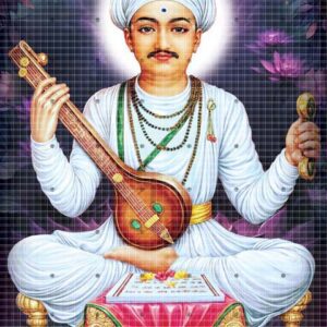 This is a sacred image of Sant Tukaram Maharaj, a key figure in the Bhakti movement. He sits cross-legged, adorned in white traditional clothes and a turban, with a calm and divine expression. Holding a tanpura and chiplya, he reflects his spiritual devotion through music and abhangs. A radiant halo around his head marks his saintly enlightenment.