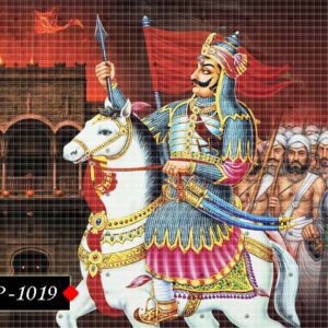 This image features Maharana Pratap on horseback, dressed in traditional Rajput warrior attire. He holds a spear in one hand, ready for battle, with a composed and bold expression. The detailed armor and weaponry highlight his status as a fearless leader. His horse, Chetak, stands loyal and poised beneath him. Together, they represent valor, loyalty, and unbreakable spirit.