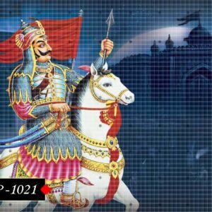 Depicted here is Maharana Pratap, one of India’s most revered warrior kings, riding his faithful steed, Chetak. Clad in royal armor, he holds a spear upright, symbolizing strength and defiance. His expression reveals determination and noble pride. The portrayal captures his heroic resistance against powerful adversaries. This image honors his role as a legendary figure in Indian history.