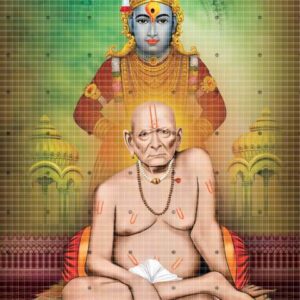 Swami Samarth is portrayed here in quiet contemplation, symbolizing his role as a divine guide. His appearance reflects spiritual mastery and renunciation. His eyes reflect inner truth. The devotional setting supports his revered image.