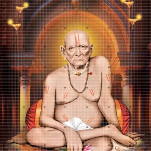 This is a devotional image of a revered Hindu saint, shown seated in a meditative and peaceful posture. He is depicted with a sacred tilak on his forehead and adorned with simple spiritual ornaments like rudraksha malas. The saint appears serene and composed, radiating wisdom and inner calm. His minimal attire reflects a life of renunciation and devotion. The devotional setting enhances the spiritual atmosphere, emphasizing his saintly presence.