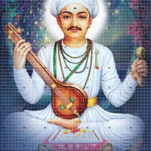 This is a devotional image of Sant Tukaram Maharaj, a prominent saint of the Bhakti movement. He is shown seated cross-legged, dressed in white traditional attire with a turban, radiating peace and divinity. In his hands, he holds a tanpura and chiplya, symbolizing his devotion through music and abhangs. A glowing halo surrounds his head, signifying his spiritual enlightenment.