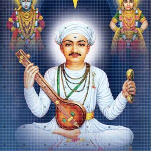 Shown here is the divine figure of Sant Tukaram Maharaj, a saint-poet of the Bhakti movement. He sits serenely, clothed in white with a turban, holding a tanpura and chiplya as symbols of his devotion through abhangs. The luminous halo around his head signifies his enlightened soul.